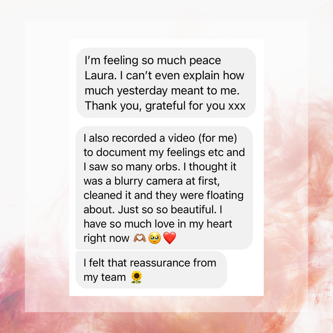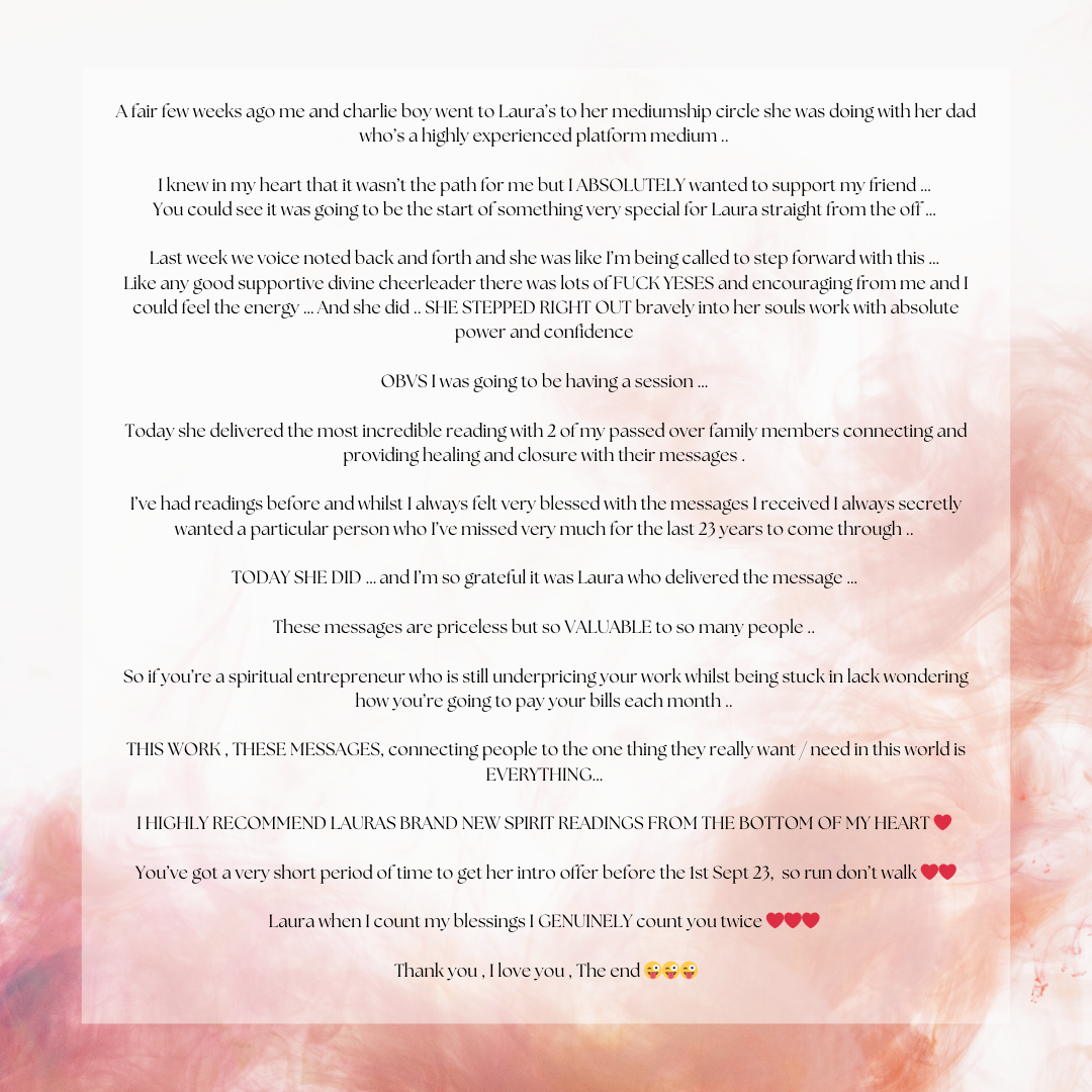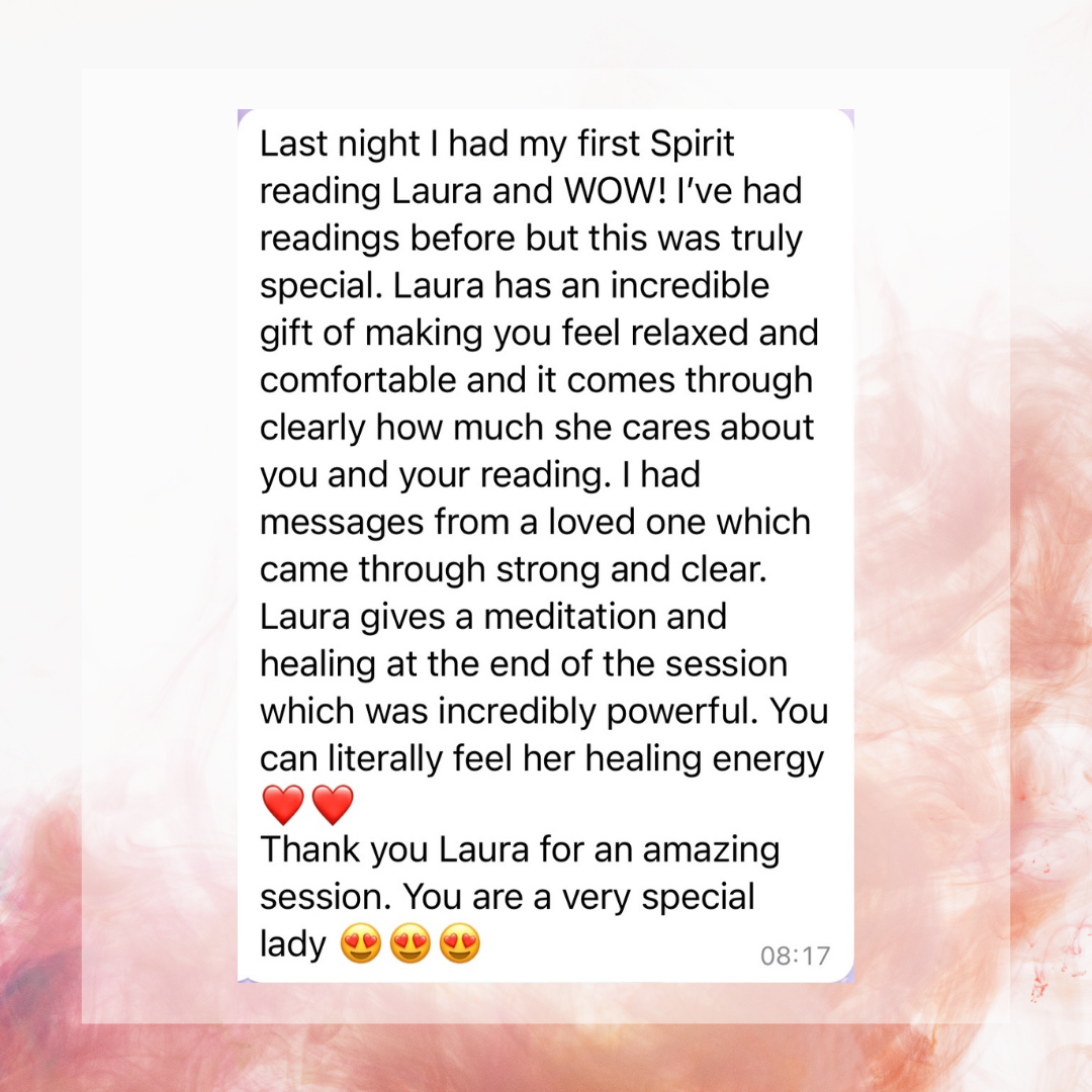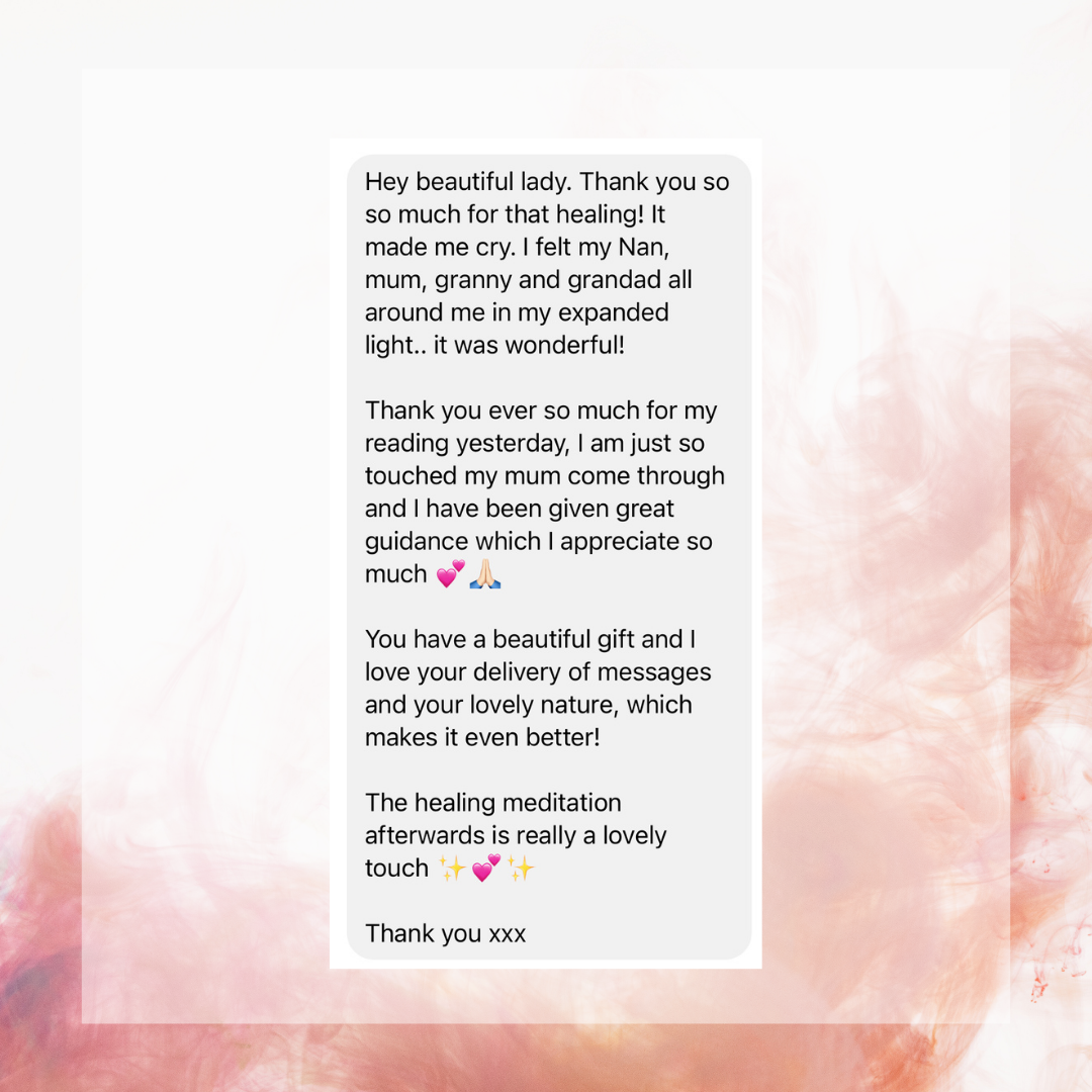 The beautifully compassionate and healing process of delivering messages from passed loved ones from the spirit plane to you. Utilising the connection to the Creator of all that is/Divine Spirit/God/The Universe, whatever you believe in with love, light and protection. An absolute joy, honour & blessing to facilitate space for.